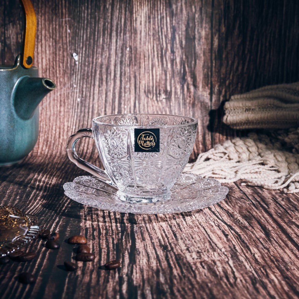 A glass fit for a queen. The TAIKYU lace Glass Cup and Saucer proves that royalty knows no status. Laced with detailed flowers and a flower-shaped saucer. this collection is perfect for reminiscing childhood days of having magical Hi-tea sessions with your friends. Our Taikyu Collection which features a series of durable glassware. Made with high quality and lead-free glass that provides a safer user experience.