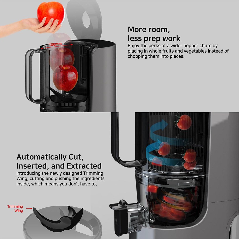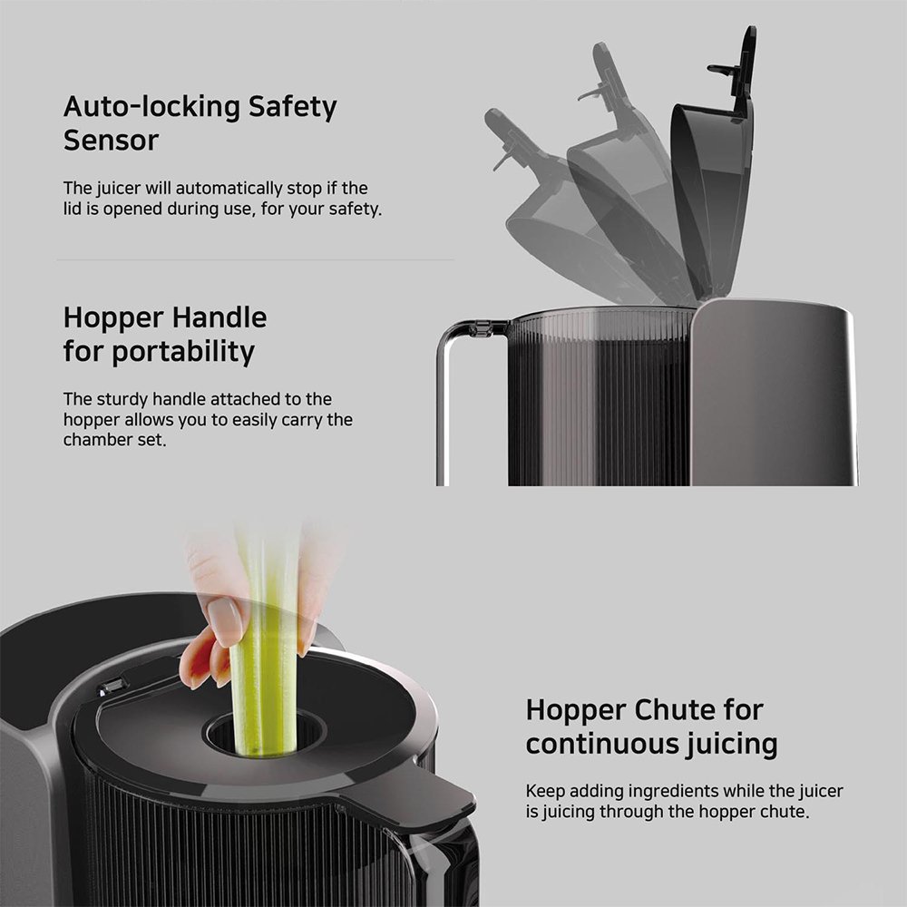 Self-Feeding Hopper:Â The H400 Slow Juicer comes with the highest volume of any self feeding hopper yet. This change is complimented by a larger opening. and a larger inlet to add more ingredients while the juicer is still running.